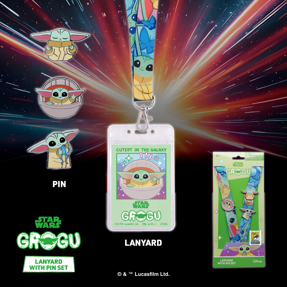 Enter the galaxy of cuteness with Monogram International’s Grogu Lanyard & Pins Set, debuting exclusively at San Diego Comic-Con Booth #3645. This collectible set celebrates the fan-favorite character from The Mandalorian with a lanyard featuring Grogu in a variety of playful poses—plus three enamel pins that capture his most iconic moments.